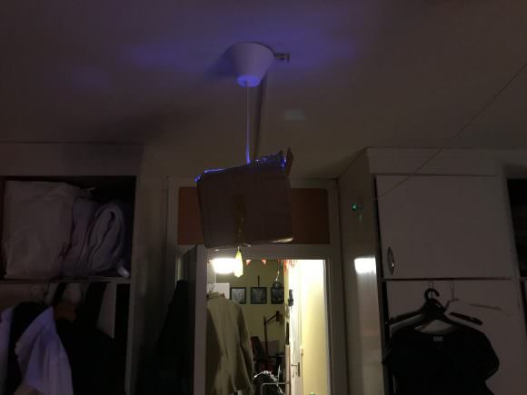 But naturally, I couldn’t find an E27 lamp socket to plug in the damn UV lamp. After rummaging through the entire apartment I still couldn’t find one, so I finally just gave up and removed the lampshade on my lighting in the bedroom. Trying to explain to my wife, why we suddenly had a cardboard box hanging from the roof with some strange blue light emanating from it was quite the experience.